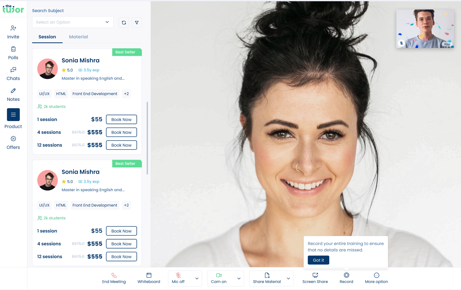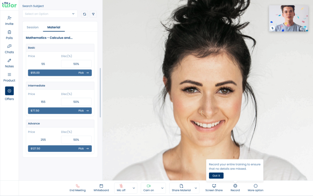 We integrated instant payment options within the web conferencing tool, allowing tutors to secure future bookings during initial sessions. Additionally, we enabled the ability to sell content, assign tasks, share materials, and use AI to transcribe and summarize notes, creating a seamless and engaging user experience.